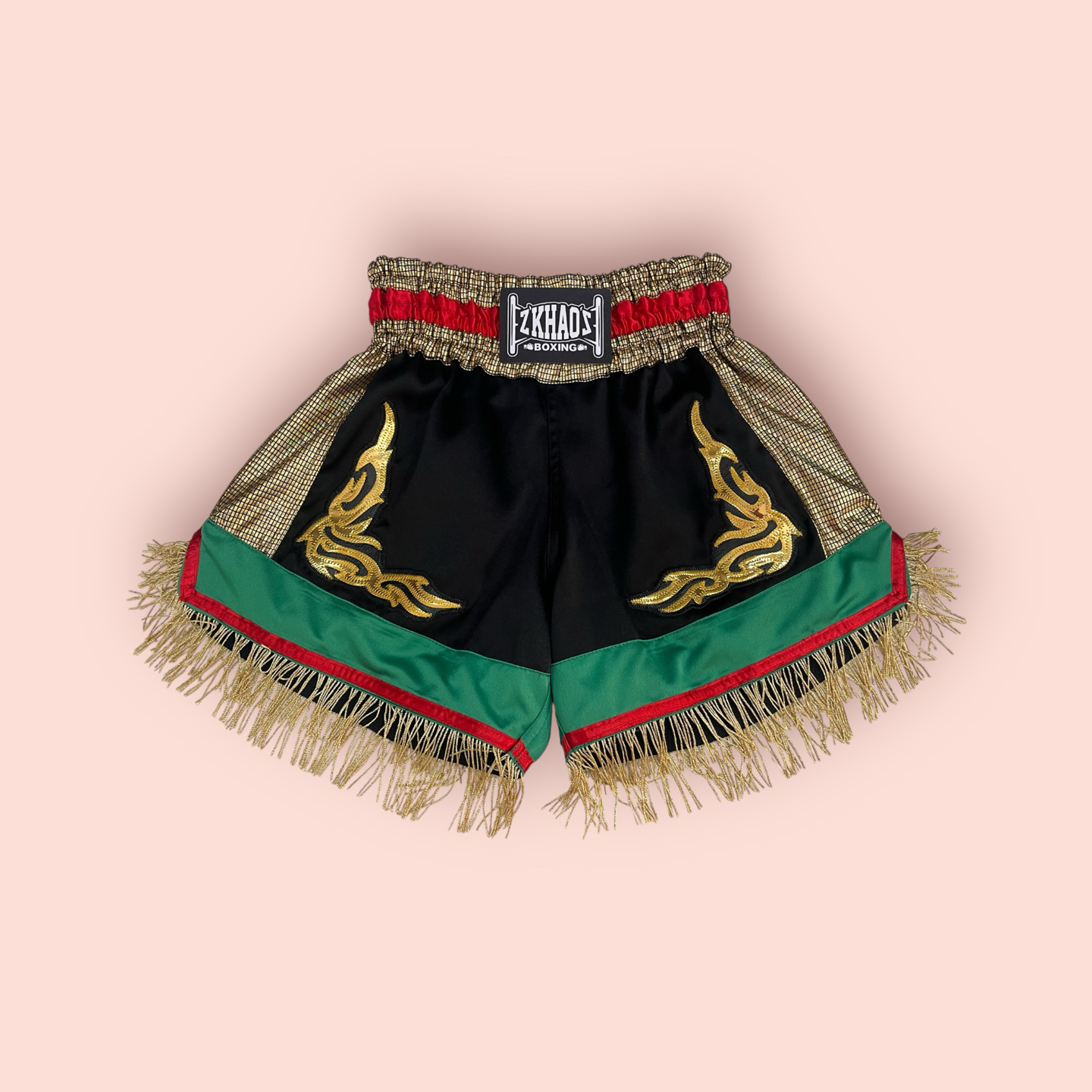 Shorts cós e laterais douradas, cetim preto no meio da peça, barra verde bandeira, franja dourada, fitas vermelhas no cos e barra, tribais dourados, peça toda forrada, modelagem retro. Cordão de regulagem na parte interna do cós.
